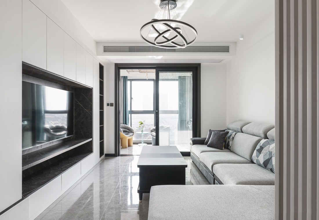 将电视嵌入白色背景墙中间,为了满足收纳需求,将背景墙整体都做成了收纳柜。