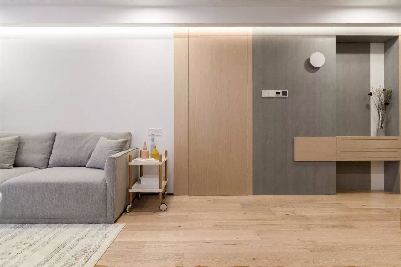 这个户型很考验设计水平,而且客户要求做很多隐形门的方式来完成这件家装的事情,客户说喜欢干净的感觉,不喜欢凌乱,要求很多储物空间都要隐藏,所以这个要求其实听起来简单,但实际需要话费很多的心思。
