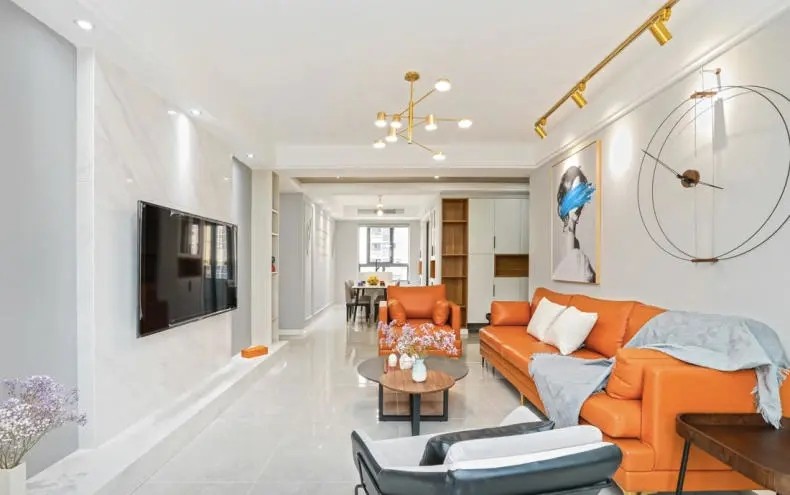 客厅简约之中透露着时尚感,这一切通过大理石材电视墙、黄铜灯饰、金属挂钟可以体现。 采用U字型摆法的沙发,围成一个舒适的休闲空间,也能让客厅更有气派。