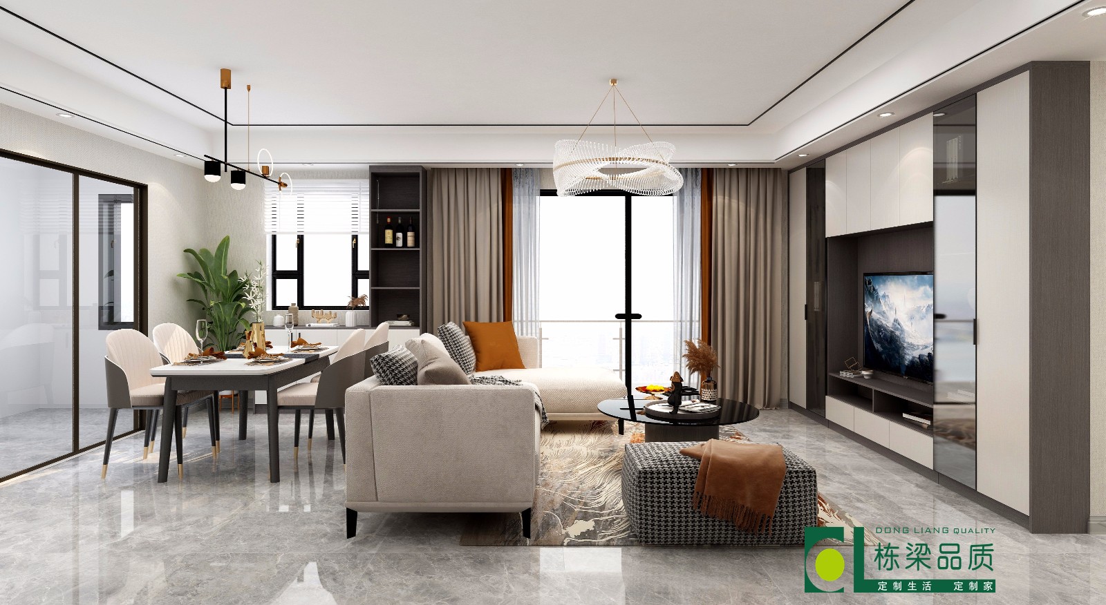 电视柜整体布局,收纳空间大大提升,搭配黑色窄边铝框玻璃门,落落大方! 餐边柜靠窗设计,很好的和餐桌相搭配一起,收纳装饰两不误!