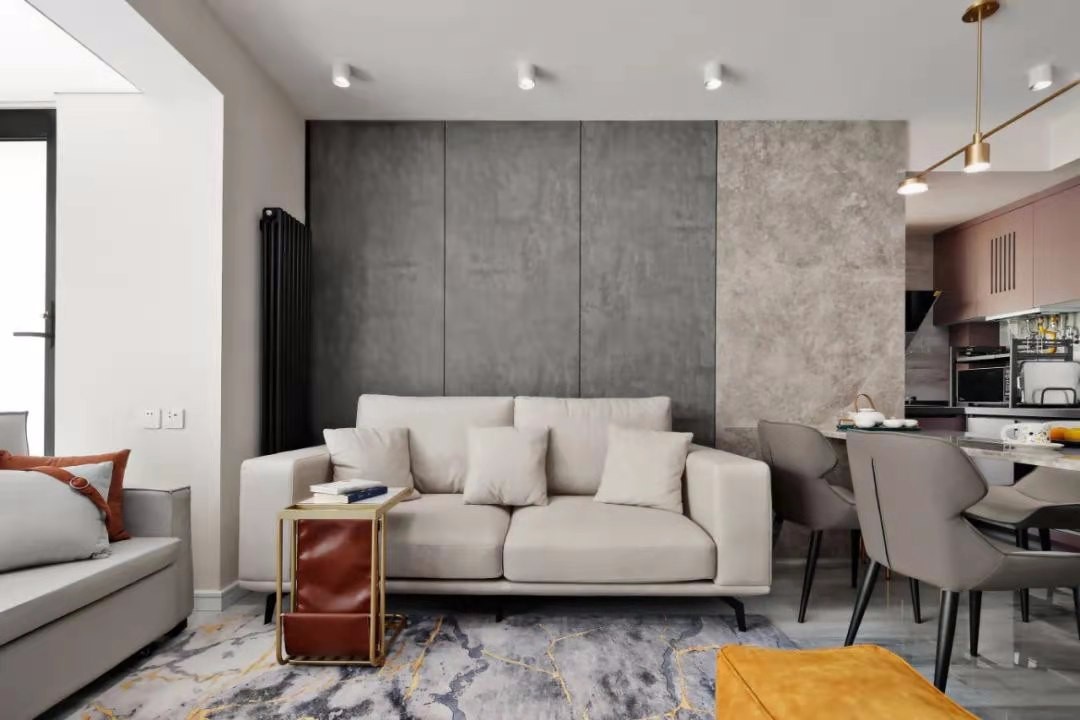沙发墙以复古灰的硬包为背景墙,摆上米白色的皮沙发,简易的金属小茶几,橘黄色的小皮凳,地上再布置一席儒雅的地毯,也让这个空间显得更加华丽自然
