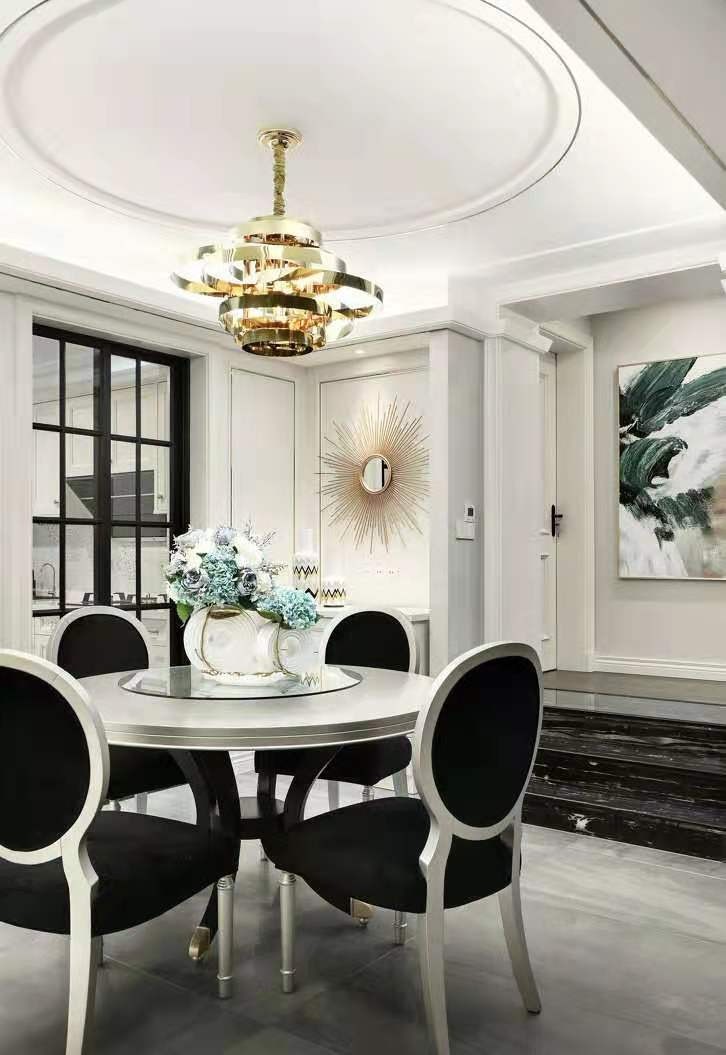客厅做了中央空调,家具和硬装部门的金属线条是美式轻奢的标配。