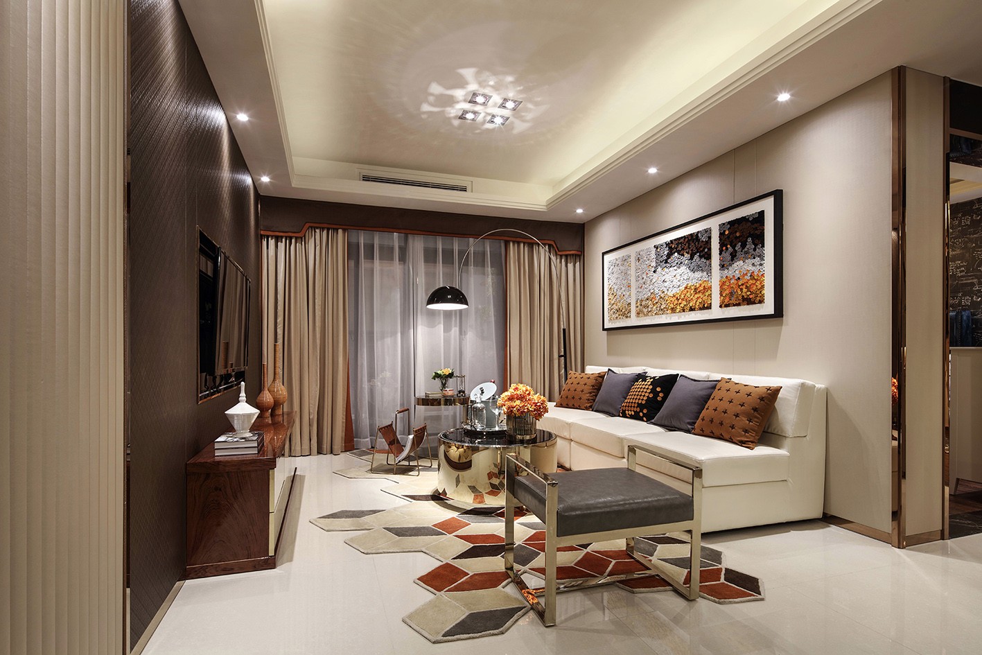 意在营造一种时尚温馨的意境:大面积咖啡色、灰色等暖色调营造空间柔软感