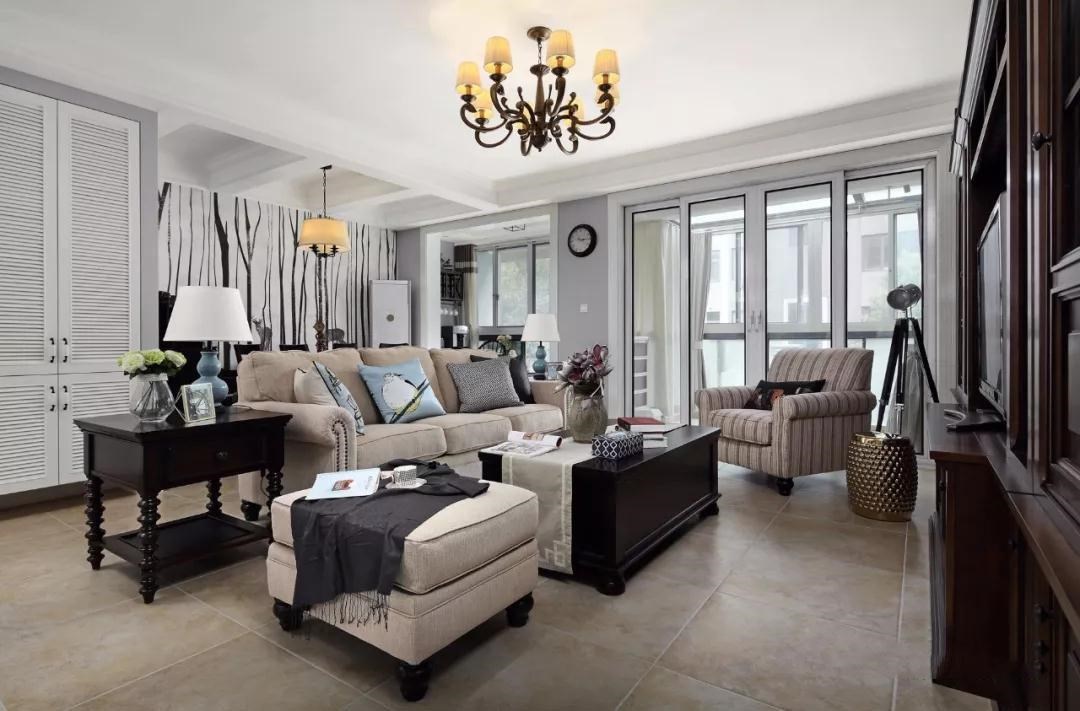 客厅,哑光仿古砖搭配美式的木质家具,一切都营造出一种轻松休闲的氛围