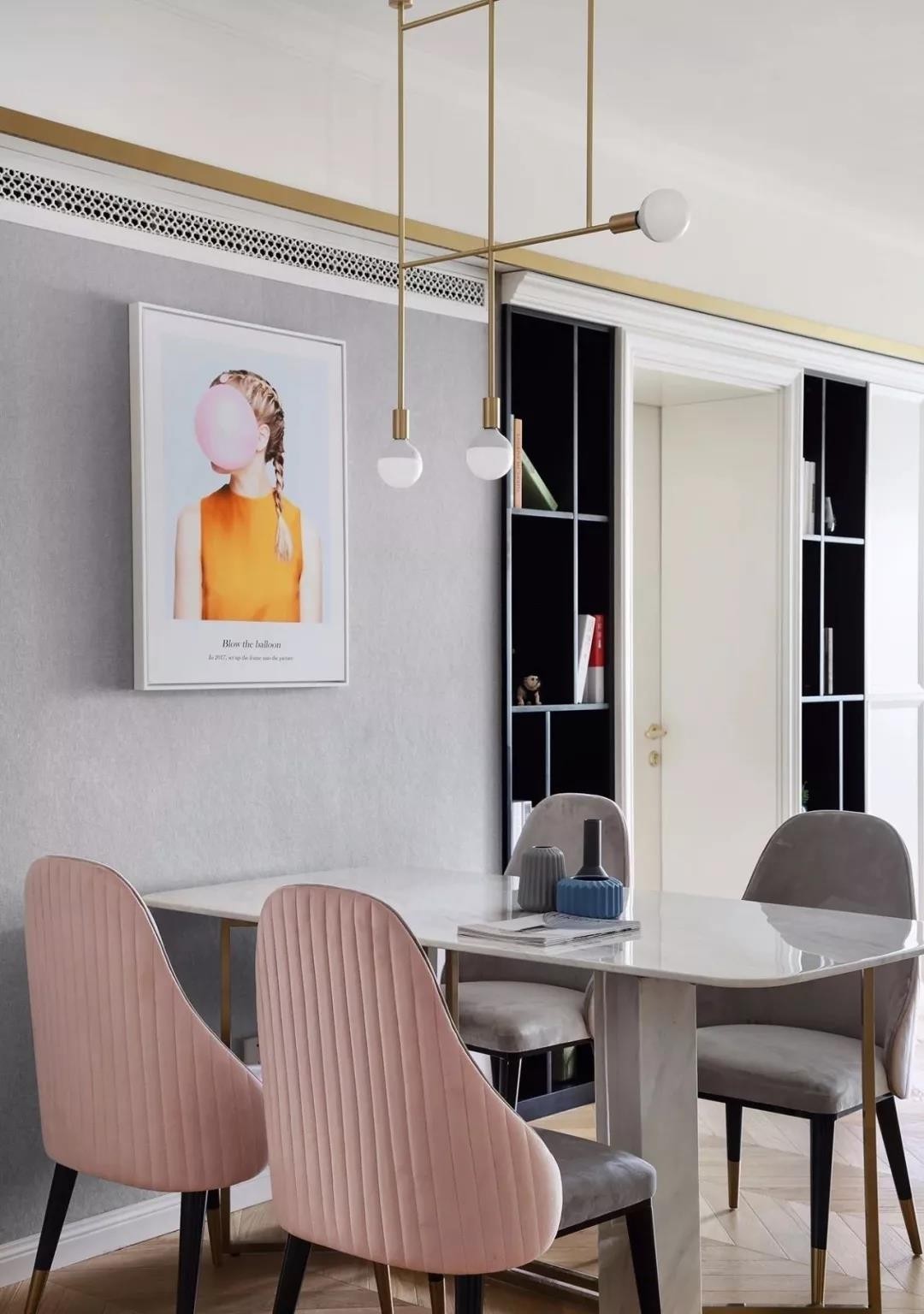 餐厅浅灰色背景配上现代感装饰画,和复古元素碰撞达到意想不到的效果。粉色餐椅与客厅背景墙相呼应。黑色壁龛充当餐边柜,实用大气
