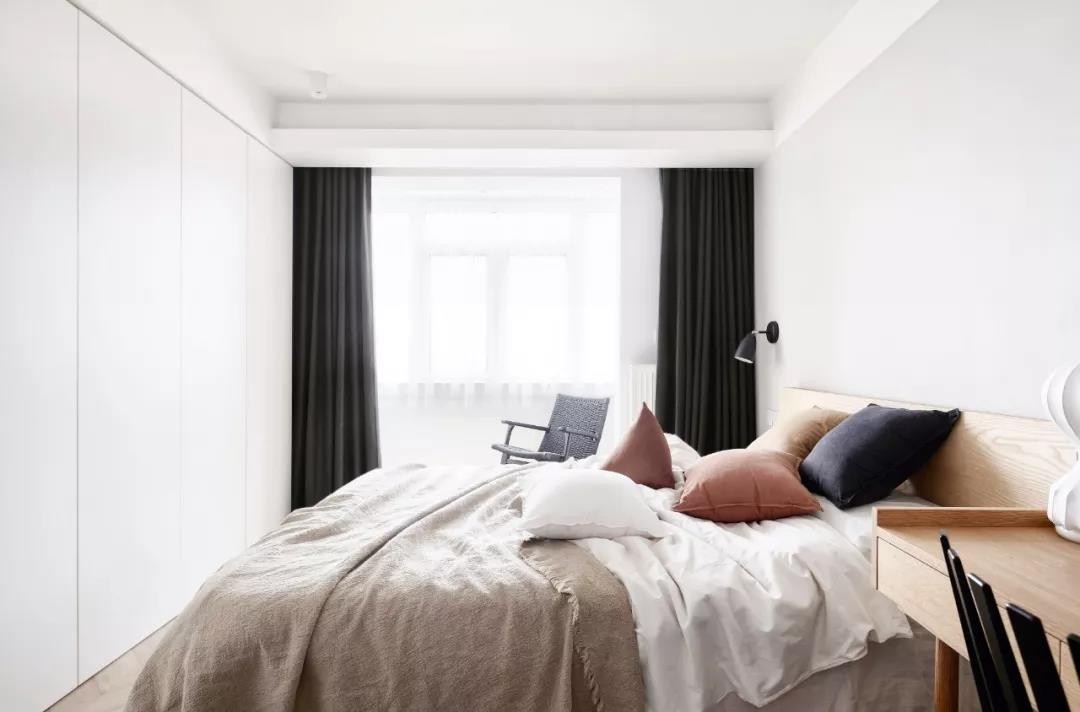 床尾定制了一墙柜子,顶天立地还嵌入墙面,而且无把手设计看起来更美观。