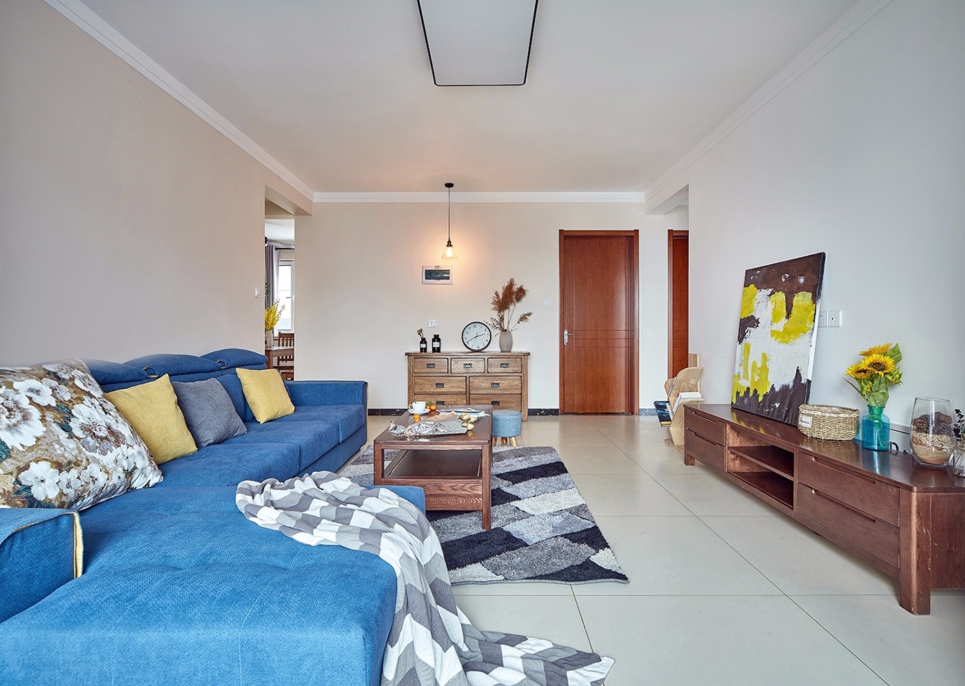 客厅用米白色的地砖,没有做吊顶,简单明了。