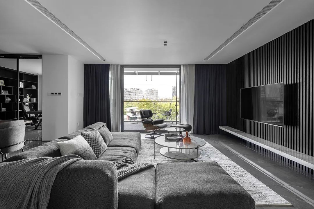 在这套200平米的复式房子中,整体采取无主灯+吊平顶天花的简约空间设计,布置现代舒适的软装家具,黑色与灰色充斥的空间下,营造出一种优雅端庄的大气与舒适氛围。