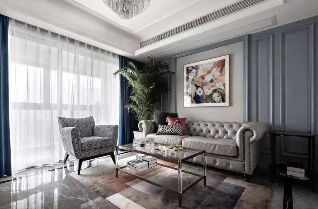这是一套125平三室的房子,整体采取现代美式的设计基调,在空间内加入了一些鲜艳额配色与轻奢的元素,呈现高贵的档次