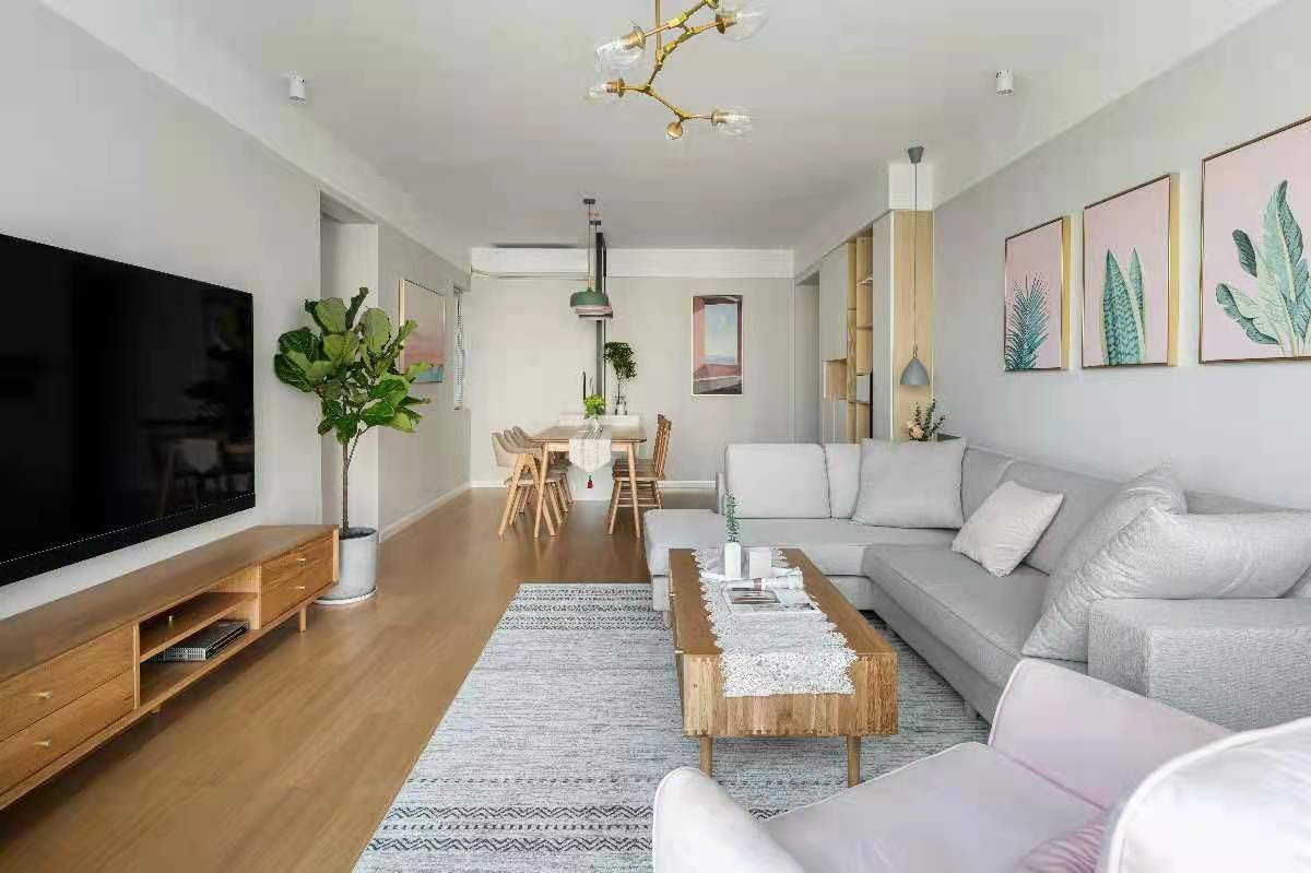 客餐厅以暖色墙面为主要背景基调,灰色布艺沙发呼应,原木实木电视柜与茶几同材质,与原木色地板一致,粉色挂画与单人沙发和抱枕作为点缀