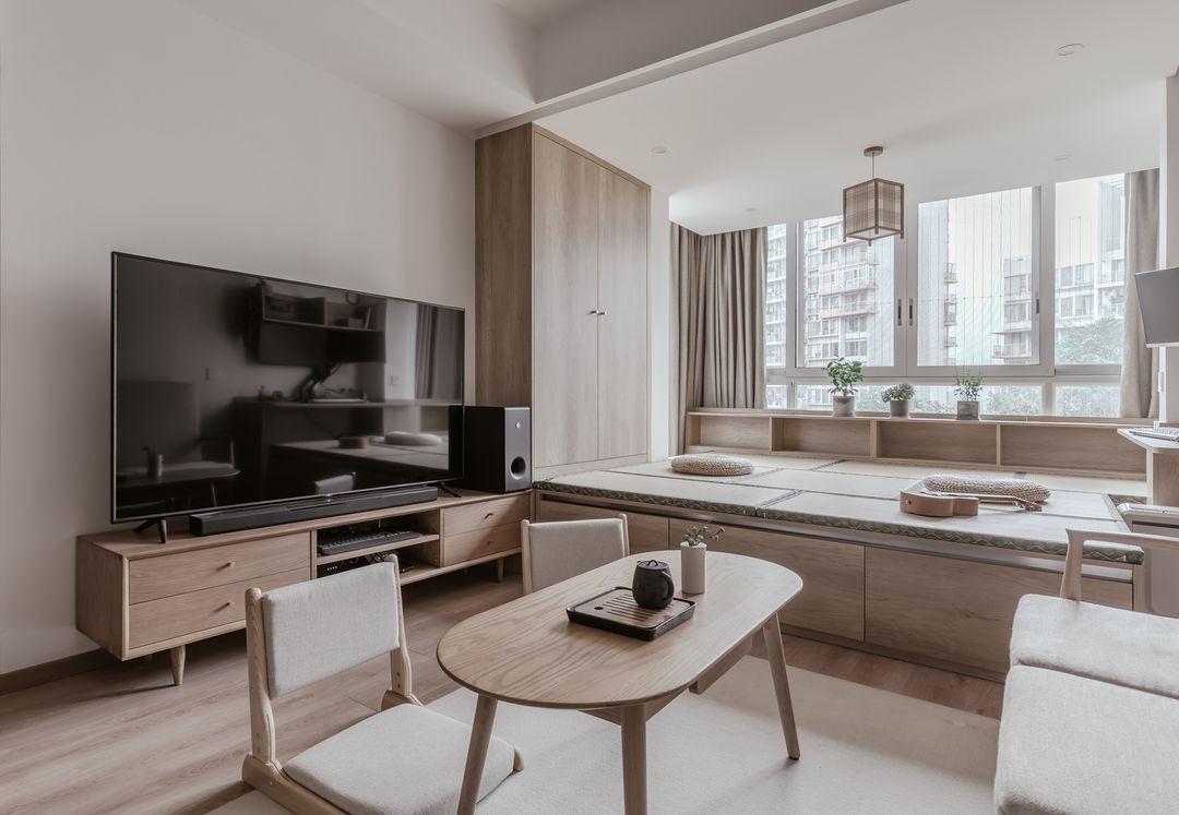 客厅,我们更注重交互性,通过与阳台的融合,及去传统化的客厅看电视待客的方式。