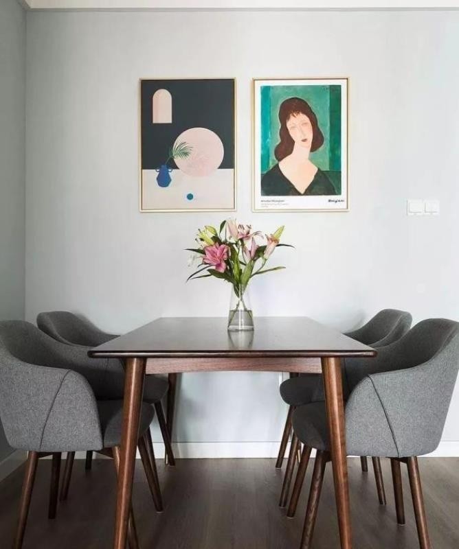 在入户门的另一侧就是餐厅空间,灰色的布艺搭配复古的木艺和金属元素,再加上墙面的装饰画和灰色调的背景墙,整个餐厅显得优雅而又文艺。