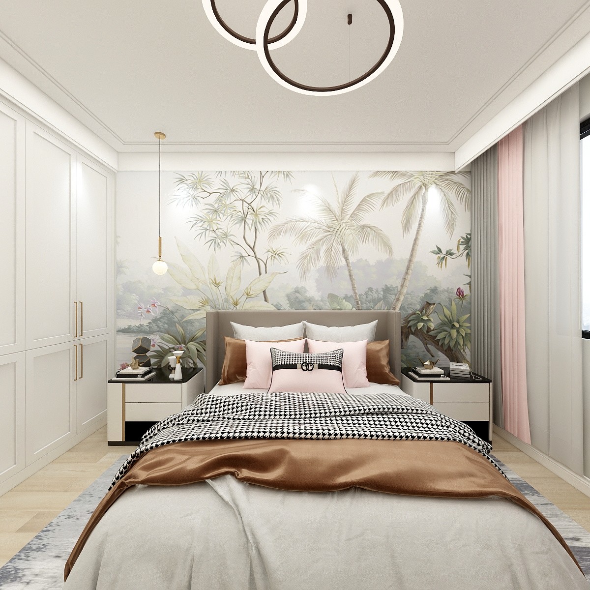 电视背景墙为大理石,电视柜选用的是金属脚样式,也有些轻奢的元素。