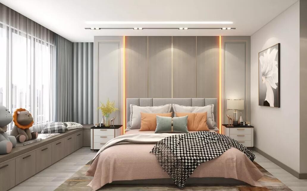 卧房,是可以卸下我们一身疲惫让身心回归自然的空间,背景墙作为进入卧室的***视线焦点,采用混搭式风格设计,极简雨丝橡木墙板与法式轻奢***灰墙板碰撞,用古铜拉丝金属线将其完美融合,以线条和材质完美堆砌出空间线性。超大采光的窗户前设计一排飘窗柜,满足了主人对储物空间的需求,又增加了空间的温馨氛围,使整个空间设计更加柔和带有生活气息。