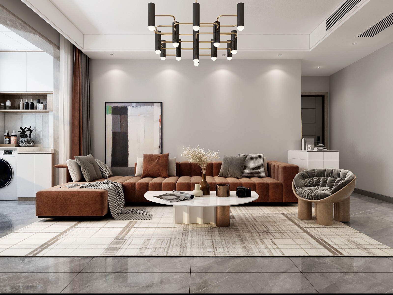 客厅的沙发考虑褐色的沙发,让整个客厅一下子活泼起来,搭配千鸟格抱枕,奶油咖的单椅