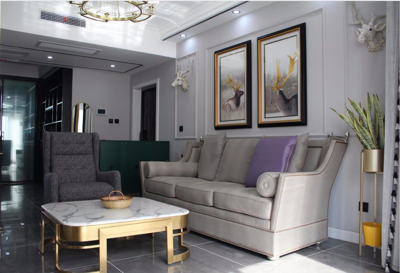 客厅灰色的墙漆加金属轻奢画