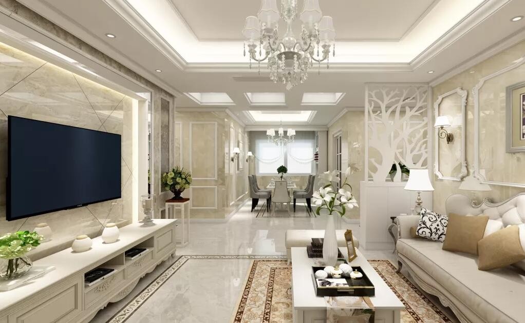 客厅背景墙采用地砖上墙斜铺,配上灯带,非常有档次。
