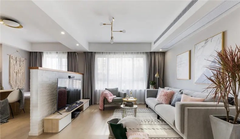 客厅一分为二,用一个半隔断的电视墙,把整个空间分成客厅和书房两个部分。 保持空间开阔,更有宽大的窗户,保证室内明亮,让人心旷神怡。