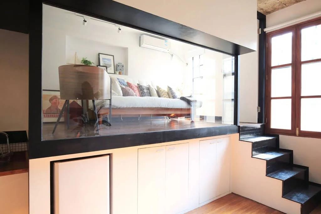 错位式的设计,下方是收纳柜,上方小舱式休闲书房。上方以玻璃隔出来,做了一个创意的舱式休闲书房,整个空间是在原有空间基础架空出来的,显得有趣舒适。下方在收纳柜的基础,还嵌入了冰箱与洗衣机,让空间利用更加到位。