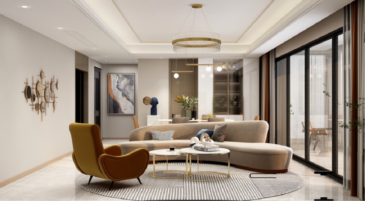 既然沙发不走寻常路,那客厅的整体平衡配比就显得更为重要。为了避免视觉上的沉重感,弱化客厅中心区域的配重,设计师放置了金属镂空脚的组合圆几。圆几与沙发就像点与线的组合,保持着一种优雅的美感。