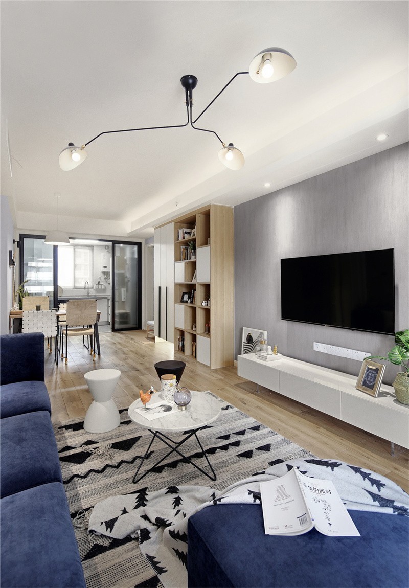 客厅沙发、电视背景墙选用墙布作为装饰,整体风格以北欧风为基础,极简的搭