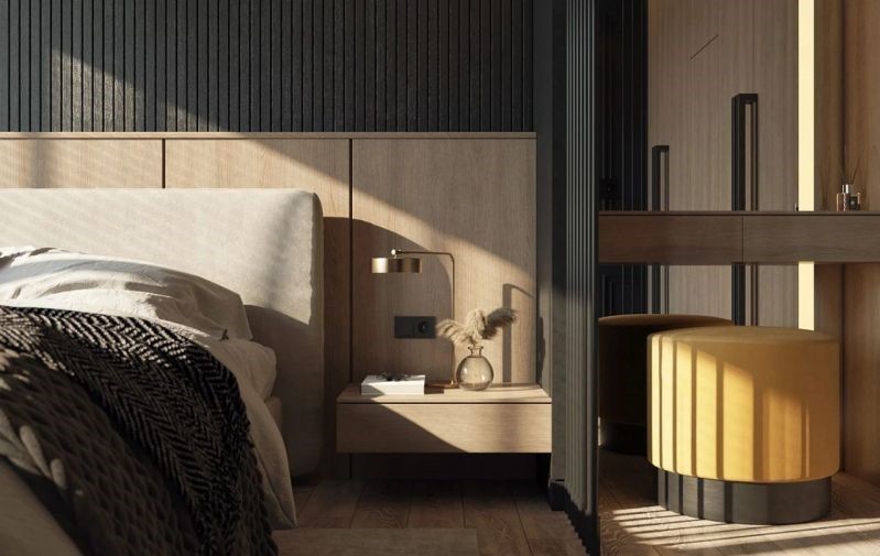 卧室同样延续客厅的风格,黑色木色相搭配,阳光通过百叶窗帘进入舒雅的温暖卧室中,屋主得以享受生活的宁静闲适。