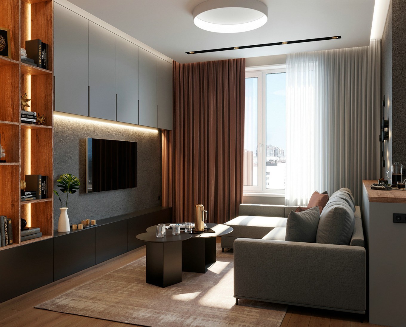 客厅采用深灰色,加以弱光源调节氛围。黑白灰的对比