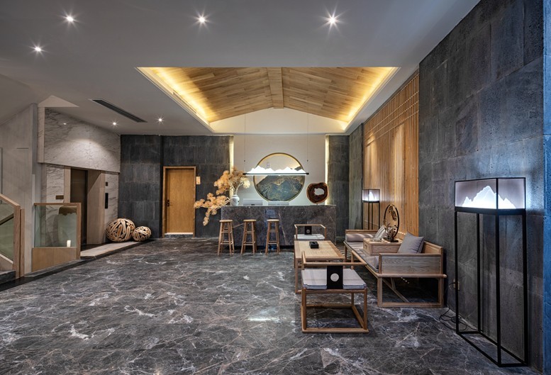 前台俨然一幅山水画,让顾客就像进入了山水世界,山水溶于圆镜,宛如一片混沌中的光亮。