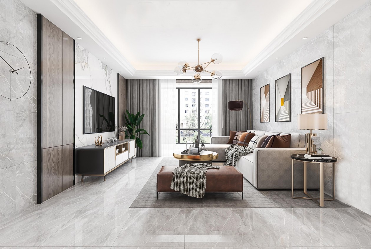 此户型为三室两厅两卫的120平米面积,现代设计风格。