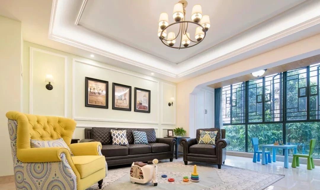 客厅简洁大气,米色背景墙十分清爽舒适,深色沙发,搭配亮黄色单人休闲沙发,铺上浅蓝色地毯,优雅内敛但不失轻快活力!