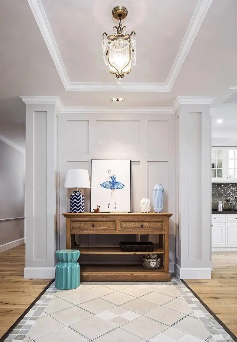 门厅是进门***眼看到的地方,也是餐厅和客厅之间的过渡区域。原木的柜体搭配白色的背景墙,简洁大方。