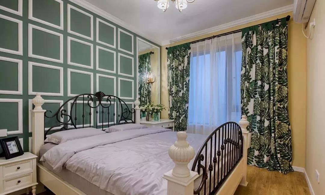 ▲ 主卧用绿色和白色大格子床头背景墙和绿色印花窗帘打造了森林风的浪漫氛围,造型优美的铁艺床架也呈现了花园古堡感觉。