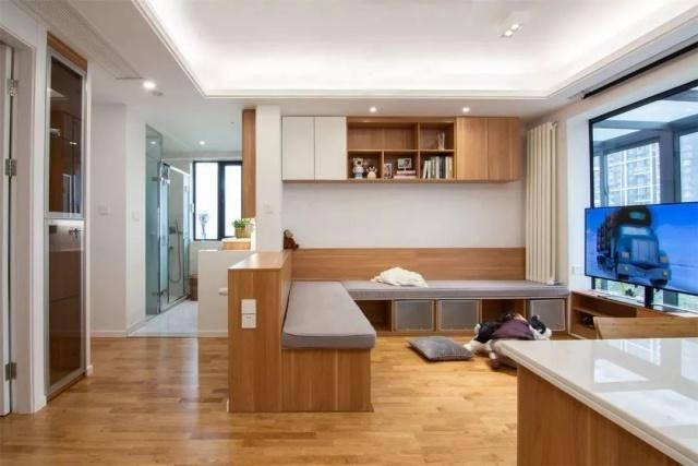 客厅和餐厅之间没有做隔断,客厅的沙发用一个L型的卡座来代替,茶几被省略掉了。电视摆放在推拉门的前方,可转动角度的电视方便平时观看。