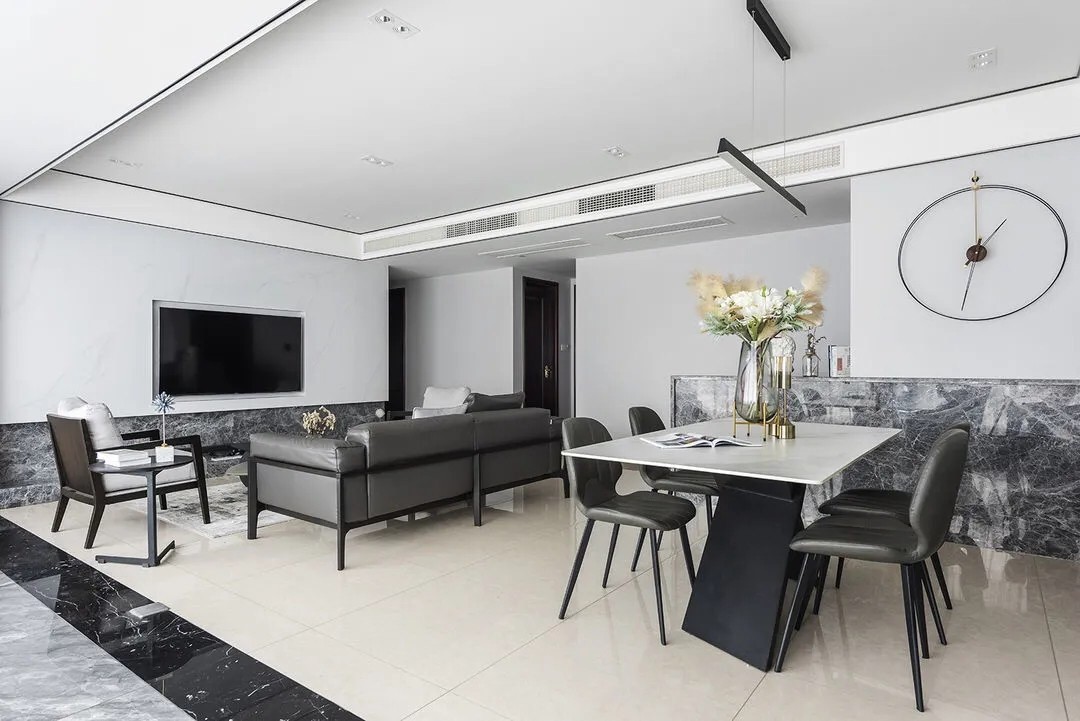 除了餐厅均采用无主灯设计,保持简练洁净的质感。 恰到好处的柔光射灯为照明带来更多层次,也中和了白墙和家具的冰冷。