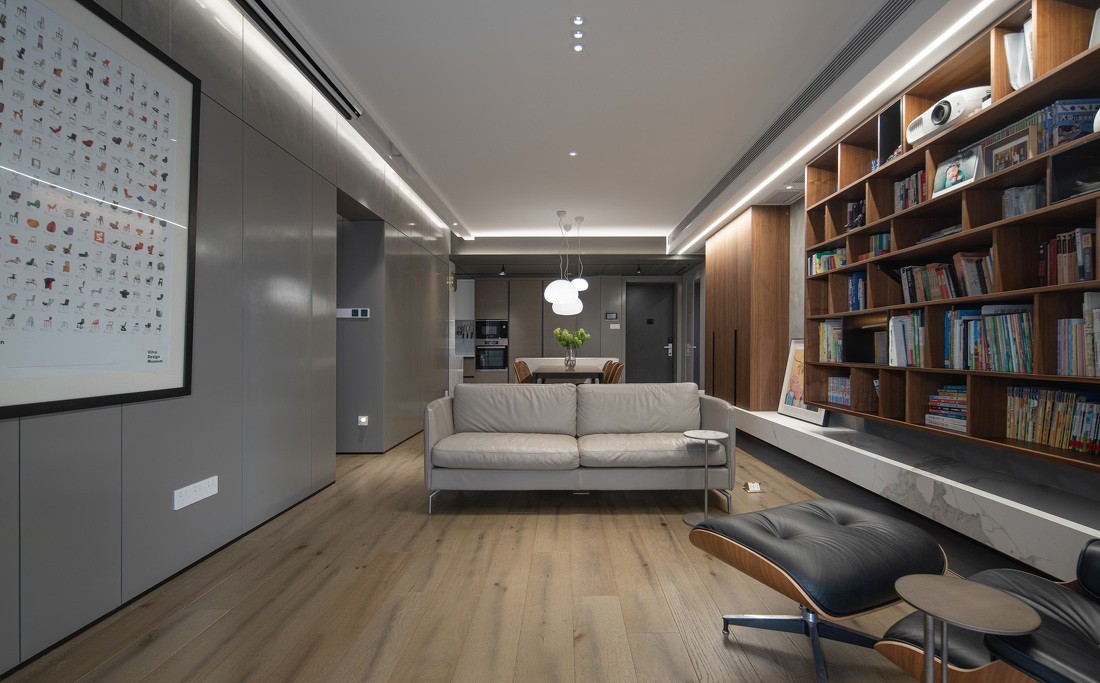 客餐厅书柜餐边柜看上去是相对独立的设计,实者是整体化考虑而来,书柜、餐边柜及中间留空的区域实际上是一个整体,
