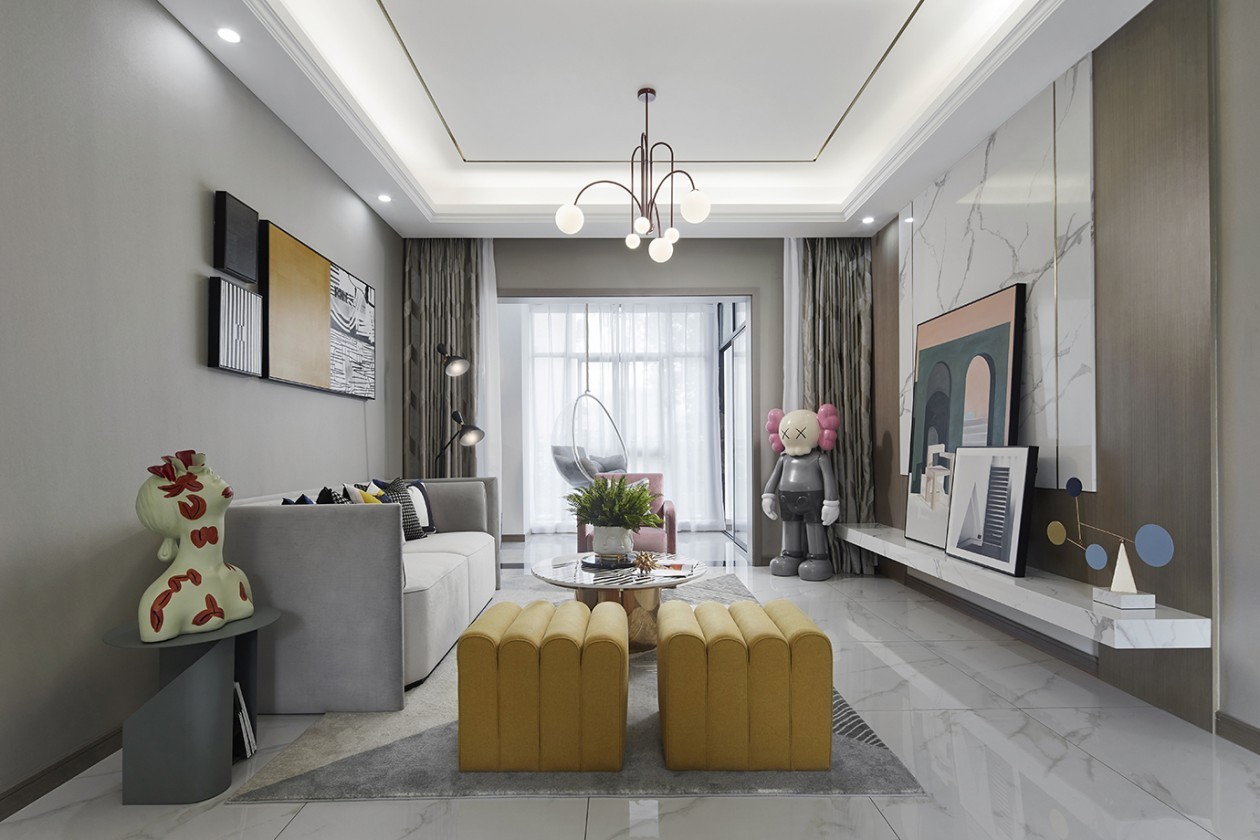 米白质感石材和灰调家具营造现代感,一抹明媚的黄率先闯入眼帘,融入简约几何图形的软装饰品