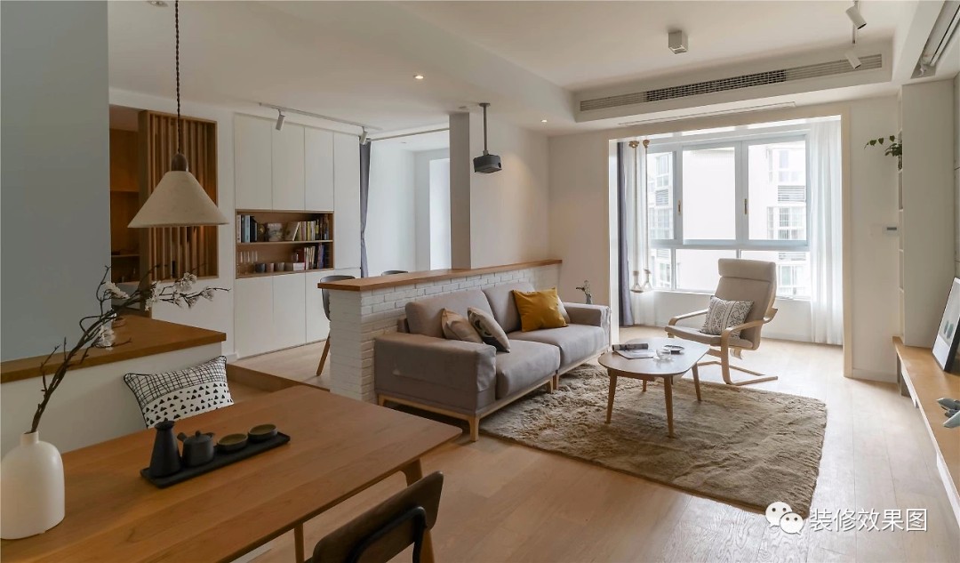 客厅与书房打通并以矮墙吧台隔开,带给了客餐厅额外的采光,原本短促的视野也几乎增长了一倍,显得宽敞了许多。