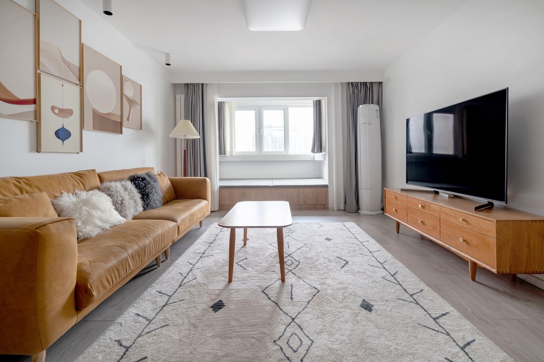 沙樱桃木的家具与焦糖色的沙发相得益彰,配色让整体的空间更加融洽