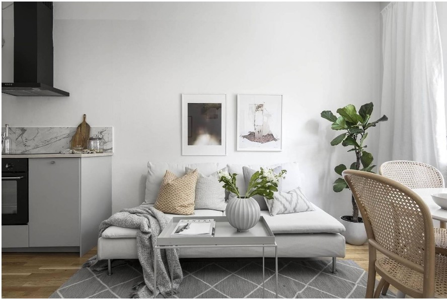主色调是白色和灰色为主,摆放绿植增添活力