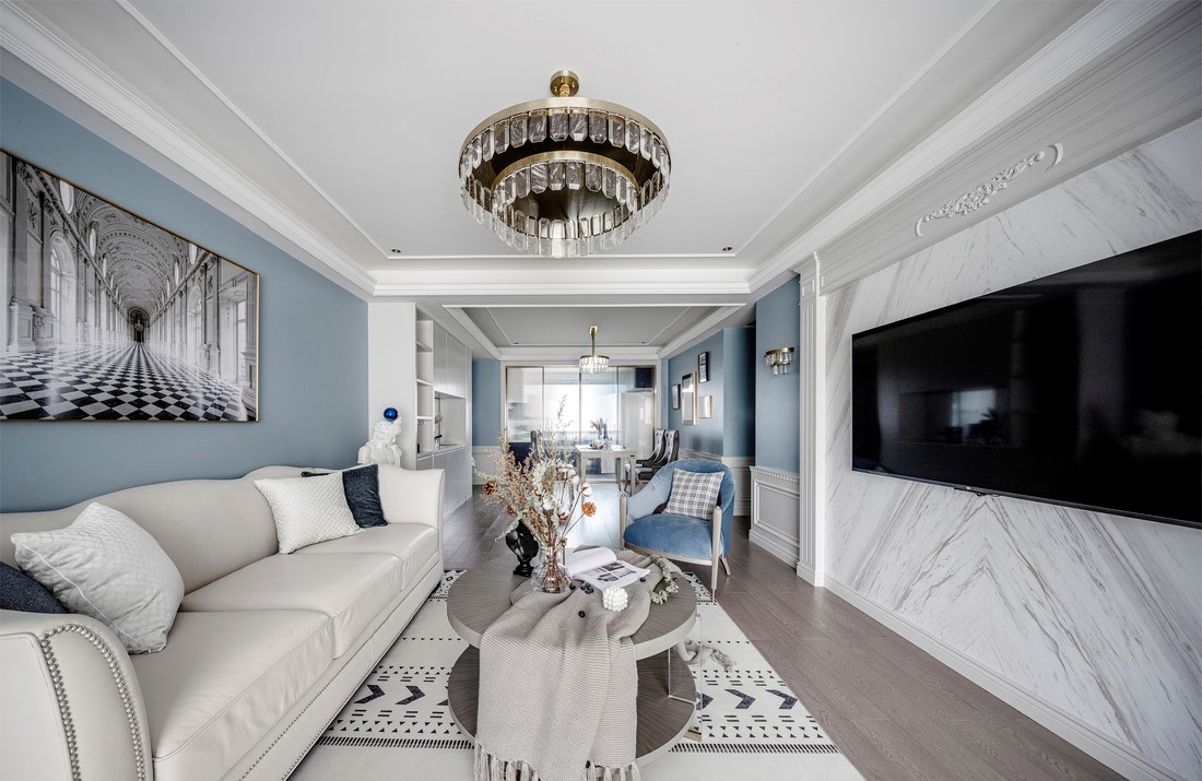业主是一个比较小资的年轻未婚女孩,喜欢美式和法式,共同探计下做了一个混美风格,融入了法式的情调及蓝色的喜好色调