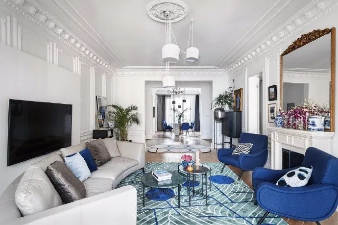 走廊的右手边是客厅,客厅大量运用饱和度比较高的色彩,同时注重细节,立体感十足的白色背景墙,在细节处,艺术雕刻,彰显艺术氛围。沙发呈不规则一字型分布,搭配两张黑白水磨石茶几,充满了质感和随和性。两张宝蓝色单人沙发和墨绿色地毯则极富扩张力,让客厅多了一份优雅沉静而又线条感十足