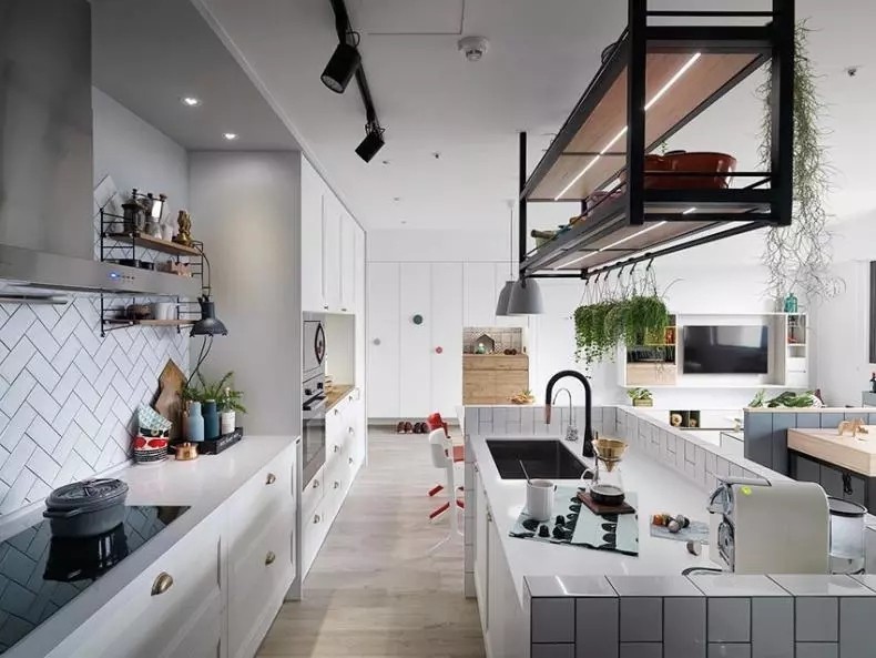 储物和烹饪功能则交给了餐桌后方的橱柜和料理区。把备菜区转移到中岛台,充分利用空间,中岛台同时也还是简单的料理台和收纳柜,实现一物多用。