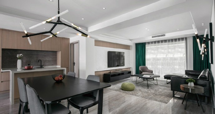 客厅以黑灰为主,色系较为深沉,具有年轻成功人士,所追求的简洁,质感以及高品质的家居环境,深绿色窗帘的点缀,成为醒目的点。