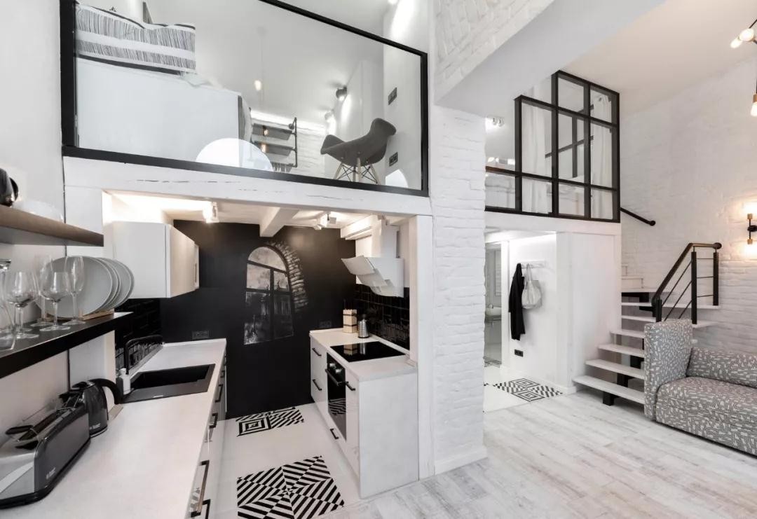 卧室、衣橱与书房都被规划在了二层的空间。这种“夹层”的设置显著地增加了公寓的使用面积,让所有房间都可以发挥它们的功能性。