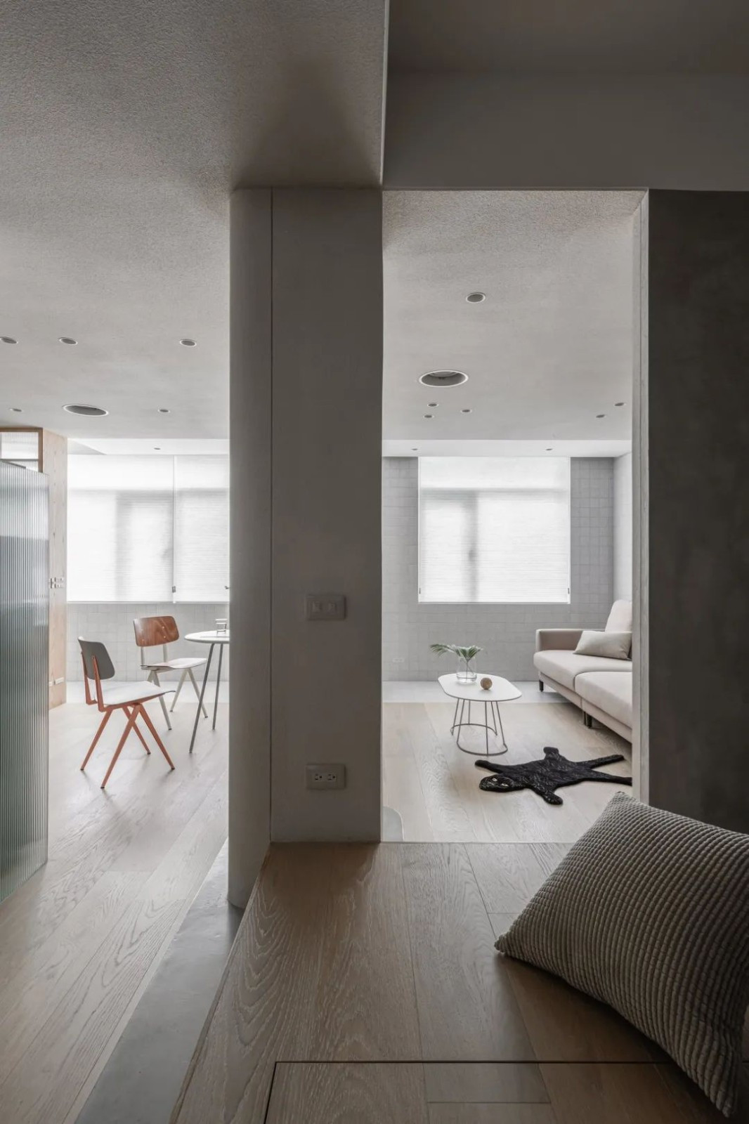 一道轻薄电视墙,划分客厅和餐厨区,既避免了开门见厅,又构成穿而不透的场域关系。