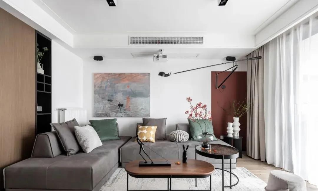 现代风的简洁中也有屋主想要的中式底蕴,角落里的那一抹红充满艺术感,插花这些细节都值得细细去品味。