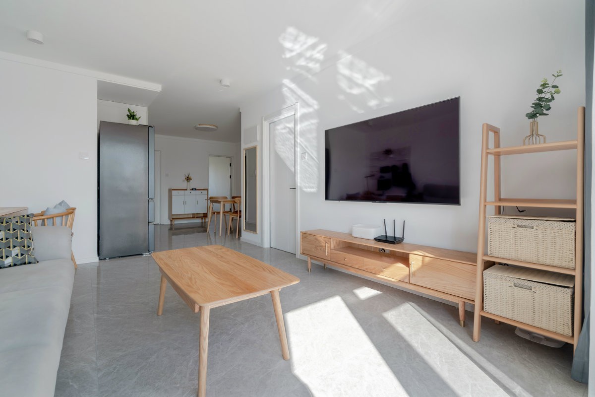 客厅墙面没有多余的装饰,以白色乳胶漆饰面整体以干净整洁为主
