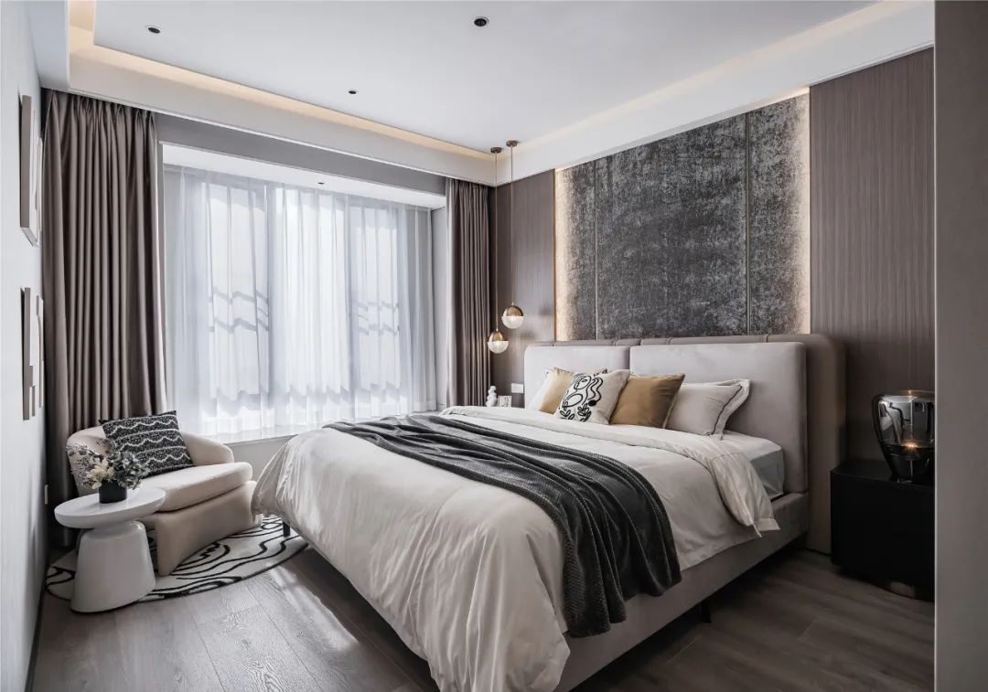 主卧是休息区,绒布包裹的床头背景墙触感柔软,搭配暖色灯光,更显优雅。