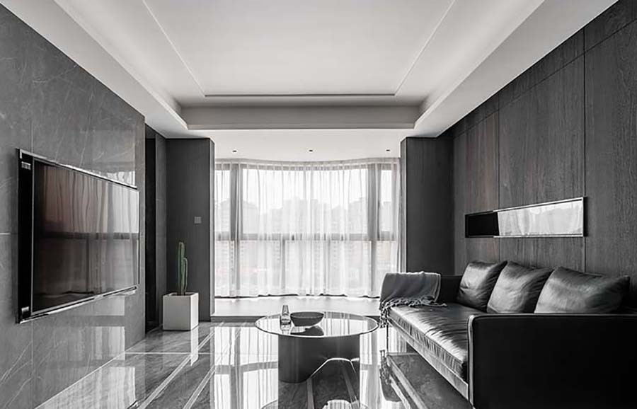 整个电视机墙面用的是质感偏硬的大板瓷砖和灰镜的组合,由于承重墙的原因要达到内嵌的电视机效果,只能在原墙面的基础上新建墙体出来,由此和灰镜面做一个高低的层次,在侧面做了一个内嵌的灯带设计。