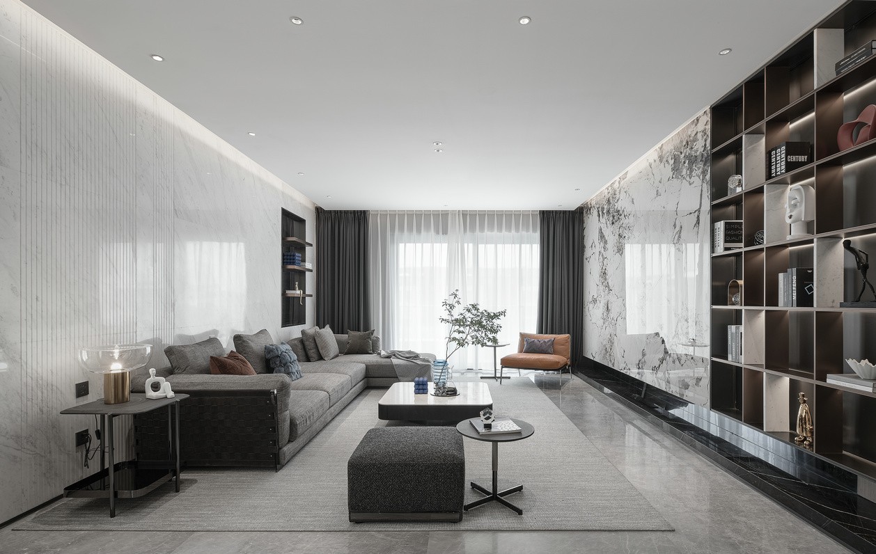 在开阔的叙事空间里,物品也有着自己的适度表达。灰白主色调与蓝、橙色块相应点缀,为淡雅的空间加入几抹跳色。